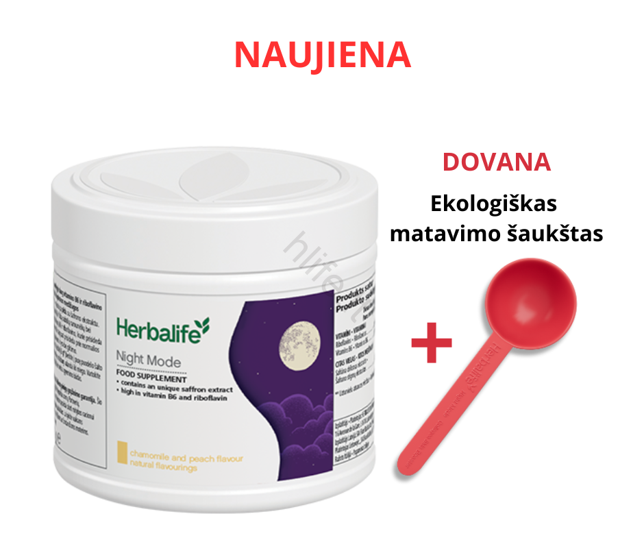 Herbalife maisto papildas „Night Mode” – natūralus vakarinis gėrimas su šafrano ekstraktu ir B grupės vitaminais, padedantis pagerinti miego kokybę vos per 7 dienas. Be cukraus, be kofeino, tinka veganams.