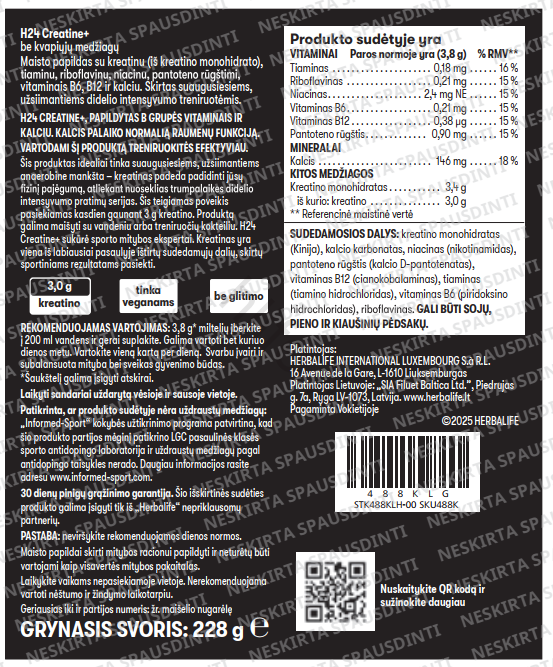Herbalife24 Creatine+ – tai veganiškas, be kvapiųjų medžiagų maisto papildas, kuriame yra 3 g kreatino (iš kreatino monohidrato), B grupės vitaminai (B6, B12, niacinas, riboflavinas, tiaminas, pantoteno rūgštis) ir kalcis. Produktą sukūrė sporto mitybos ekspertai, kad jis padėtų treniruotis efektyviau ir palaikyti raumenų funkciją esant didelio intensyvumo fiziniam krūviui.